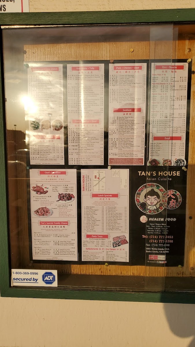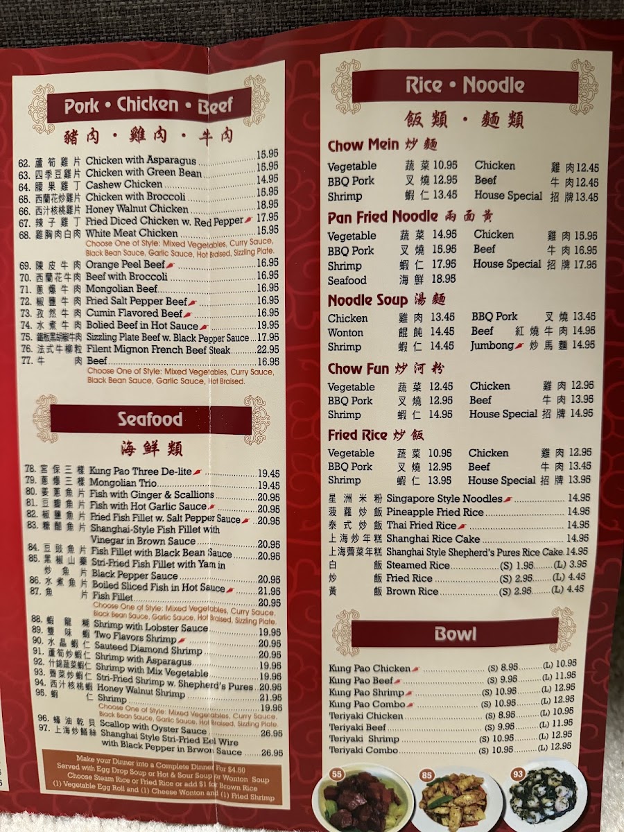 4 cheese wonton, 4 fried shrimp, kung pao beef (spicy), orange peel chicken, shrimp with mixed vegetable, house special chow mein, soup and choice of rice.