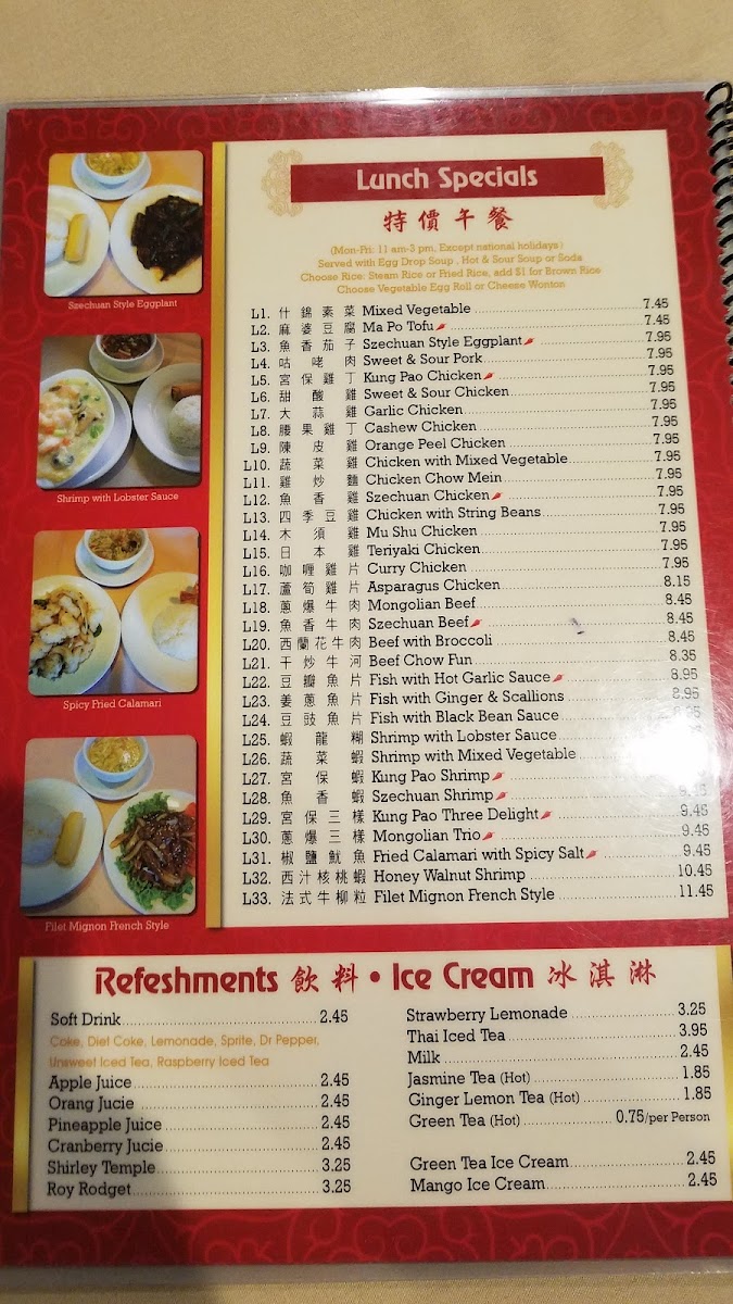 Filet mignon in a French-inspired sauce. Options for rice include brown, fried, or steamed. Choose from cheese crab rangoon or a vegetable egg roll. Selection of soup or drink encompasses a mix of sodas and traditional soups.